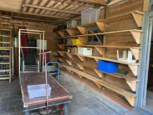 De loods is heel belangrijk voor ons. We slaan er alles waar we in het kerkgebouw zelf geen ruimte voor hebben. Spullen voor de boek- en plaattafel, podiumdelen voor concerten, apparatuur voor optredens, vitrines voor exposities en nog veel meer.